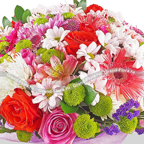 Стандартный (на фото): роза розовая - 3 шт., роза белая - 3 шт., роза красная - 5 шт., гербера розовая - 2 шт., гербера малиновая - 3 шт., хризантема кустовая (белая и розовая) - 5 шт., хризантема кустовая зеленая - 2 шт., хризантема одноголовая белая - 2 шт., альстромерия (белая и розовая) - 2 шт., статица - 1 шт., фетр фиолетовый.Диаметр букета 30х30 см.