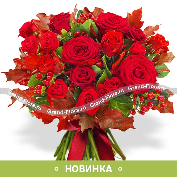 Яркий букет, составленный из насыщенно-красных роз и изящных осенних листьев. Каждый лепесток этого прекрасного букета расскажет девушке, как сильно Вы ее любите!