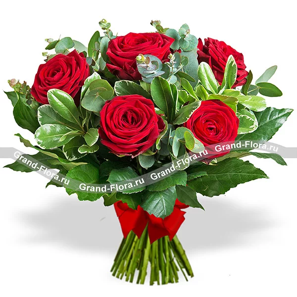 5 роз: роза красная - 5 шт., рускус - 3 шт., эвкалипт - 2 шт., упаковка, бант красный.
