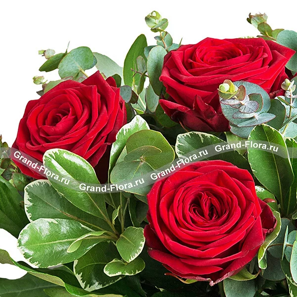 Букет из красных роз, гармонично дополненный рускусом и эвкалиптом, станет отличным поздравлением как для женщин, так и для мужчин.